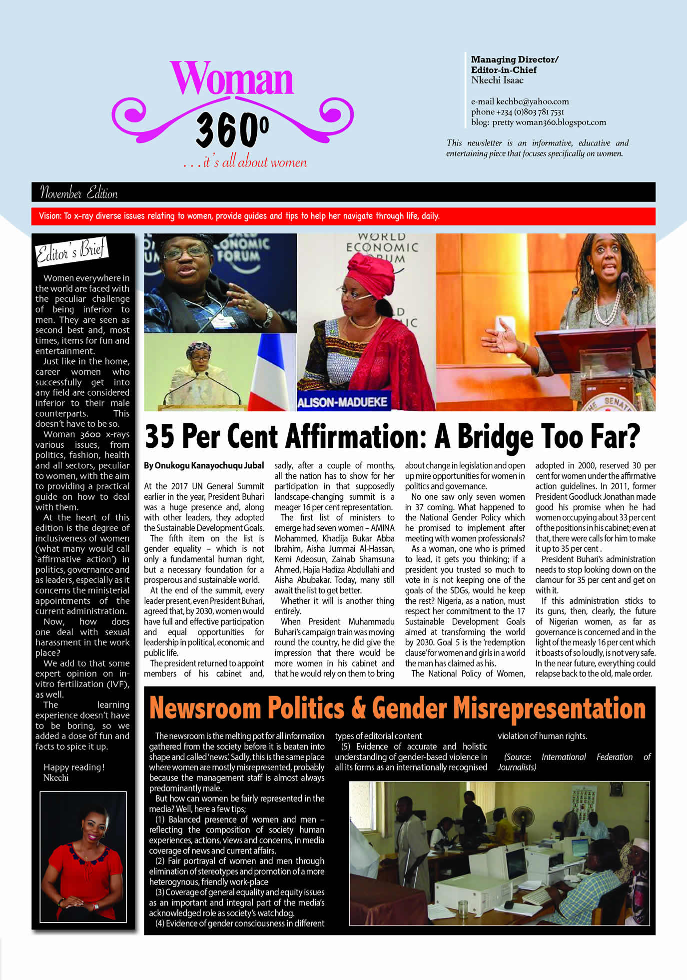 Nkechi Isaac of Leadership Newspaper committed herself to producing and disseminating Woman 360o, an online newsletter that focuses on women issues. With Woman 360o, Nkechi sensitises female reporters and women in general about women rights and privileges, so that they can contribute their quota to the development of their homes and the society, without fear. The newsletter also helps women navigate through the peculiar challenges they are faced with on daily basis.