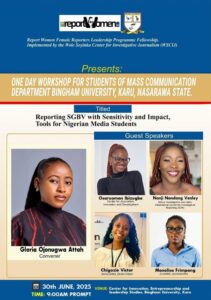 As part of her activities under the 2025 Report Women! Female Reporters Leadership Programme (FRLP), Champion Building Edition, Gloria Attah, News Anchor and Reporter, Clearview TV, organised an on-site and hybrid training on gender-based violence reporting for 15 students (10 females and 5 males) of Bingham University, Nasarawa State.